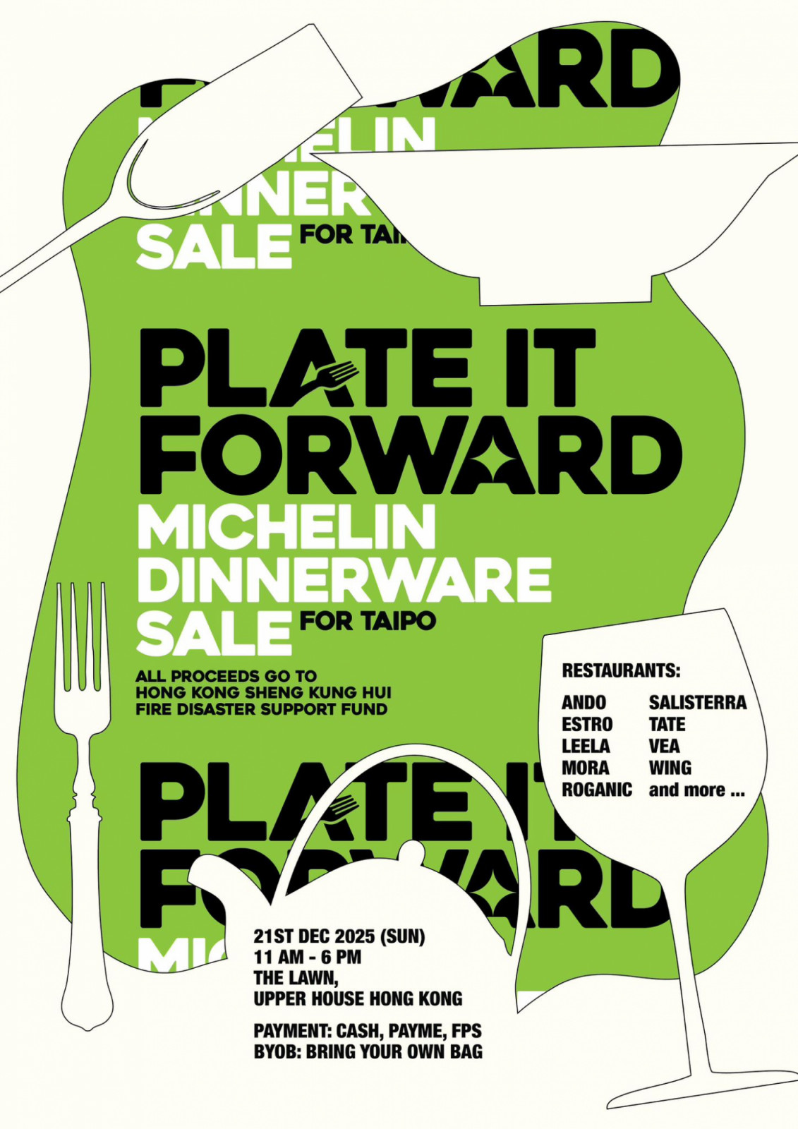 Plate It Forward, organised by Gloria Chung of @foodandtravelhk, brings together Hong Kong’s dining community for a one-day dinnerware sale in support of Tai Po relief efforts, turning surplus restaurant tableware into meaningful aid. Taking place on December 21 at The Lawn, Upper House, the event features participating restaurants, including Andō, Estro, Leela, Mora, Roganic, Wing, and others, offering plates, bowls, and cutlery sets at accessible prices, with all proceeds directed to fire disaster support. It’s a practical and well-considered way to extend the life of beautiful dining pieces while giving back, with payment options including cash, PayMe, and FPS, and guests encouraged to bring their own bags.