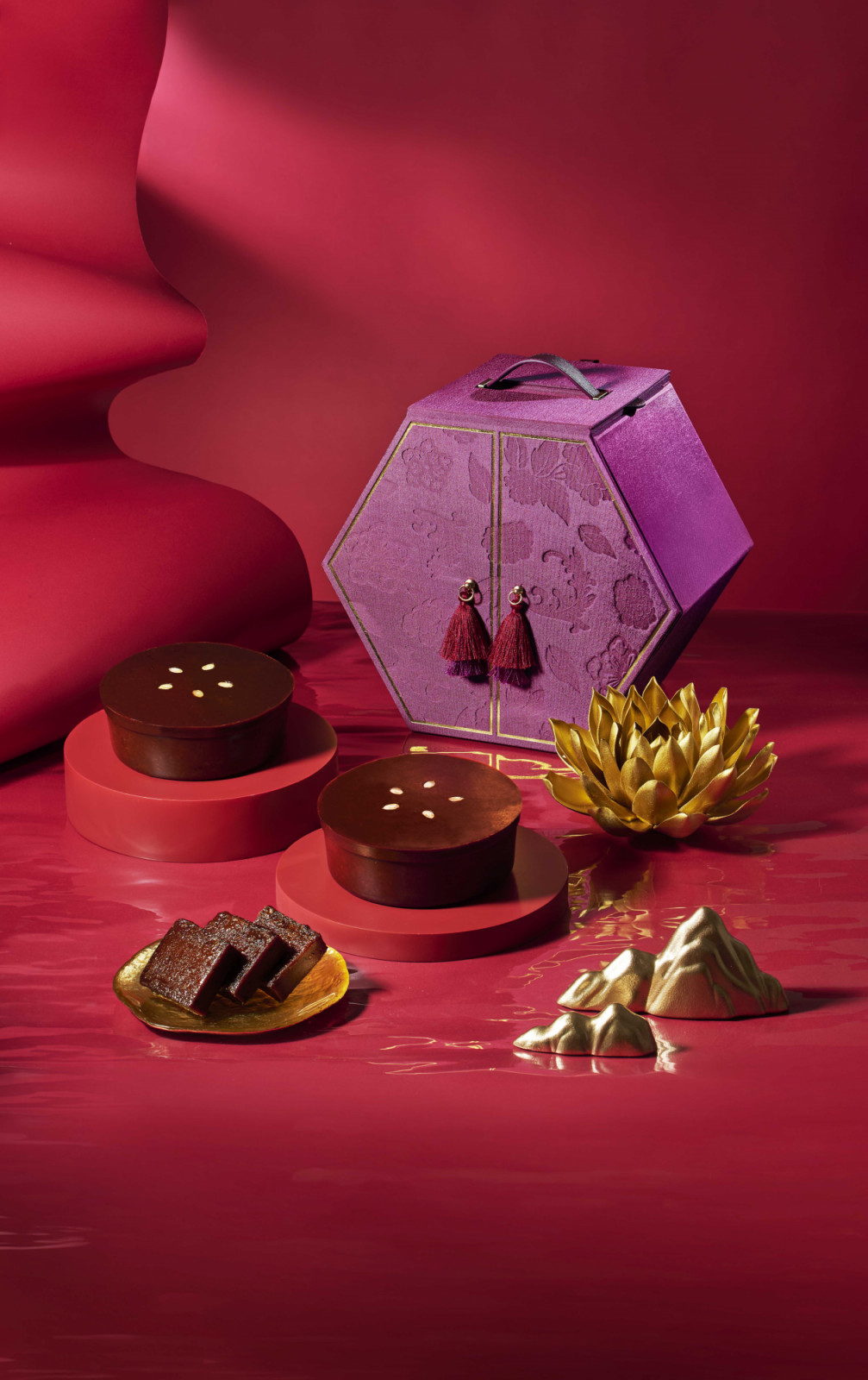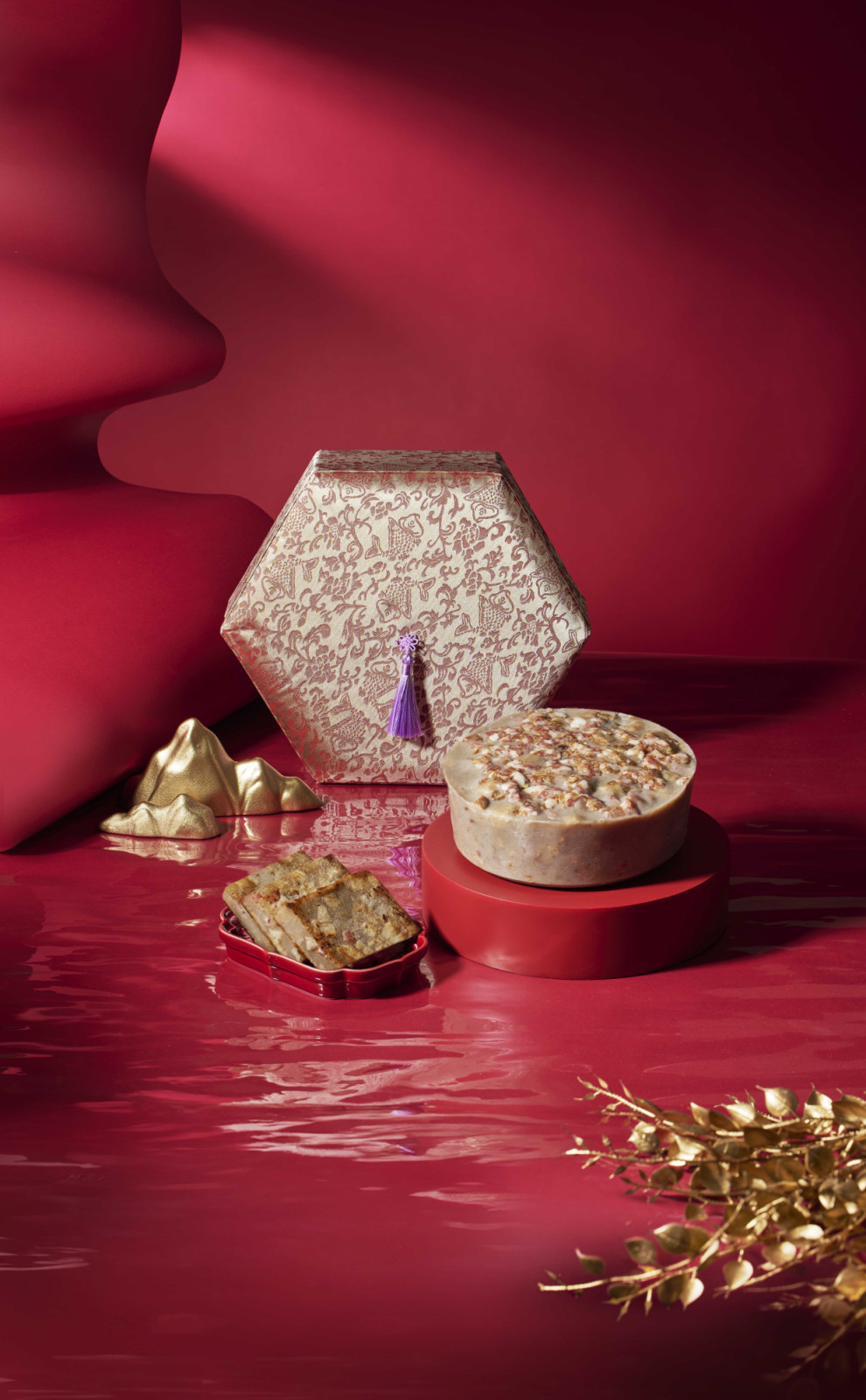 A refined duo crafted with rare 80-year-aged dried tangerine peel, paired respectively with sweet red bean and 15-year-aged Pu-erh tea. The puddings offer layered aromas and gentle depth, presented in a burgundy silk hexagonal box that can be repurposed as a jewellery case long after the festivities.